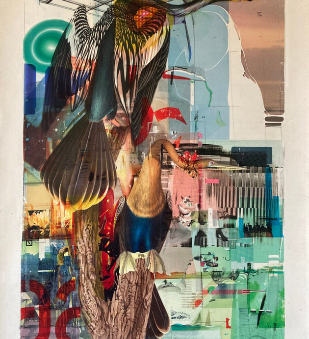 The most recent series reinterprets John James Audubon’s Birds of America through a lens of confinement, resilience, and reclamation. Rendered first in acrylic, the birds are then layered with ink transfers, creating images that hover between the real and the fragmented, mirroring the disjointed experience of our contemporary social and technological environment. By working with Audubon’s legacy, I seek to transform a darker personal history with the artist into something fluid and creative: a reframing, a reconciliation, and, ultimately, a gesture toward redemption.”